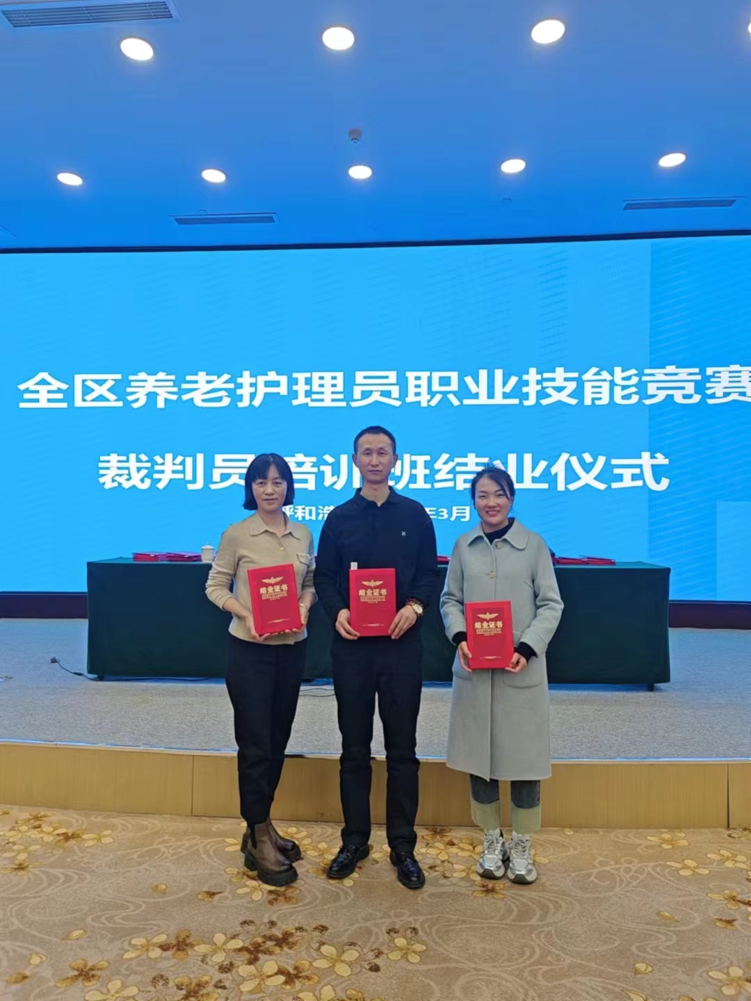 近日,首届内蒙古自治区民政行业职业技能大赛在呼和浩特举行。阿职院医护系选派的青年教师杨瑞霞经过多轮培训和层层严格考核,获得“全区民政行业职业技能大赛裁判员资格”并受邀为大赛养老护理赛项执裁。