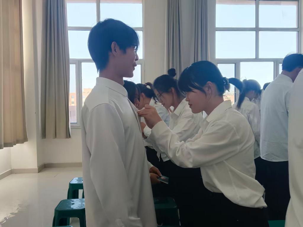 仪式在雄壮的国歌声中拉开帷幕。全体人员肃立,高唱国歌,在激昂的旋律中感悟家国情怀与青年使命。团总支书记苏婵娟老师宣读了新团员名单,现场响起热烈掌声,向新团员表示祝贺。随后,老团员代表为新团员佩戴团徽,苏婵娟老师为新团员颁发团员证书。熠熠生辉的团徽不仅象征着光荣,更承载着责任与担当。