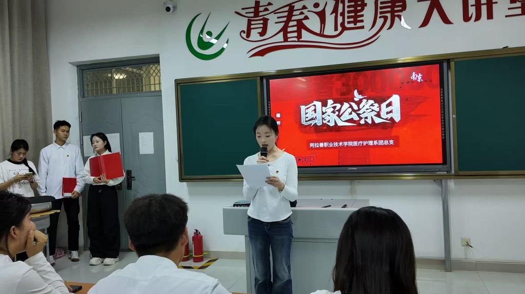 为深入推进爱国主义教育,传承红色基因、弘扬民族精神,切实增强青年学生的历史责任感与时代使命感,12月11日,阿拉善职业技术学院医护系团总支在医护楼314教室组织开展国家公祭日主题教育活动,引导学子铭记历史、珍爱和平、砥砺奋进。